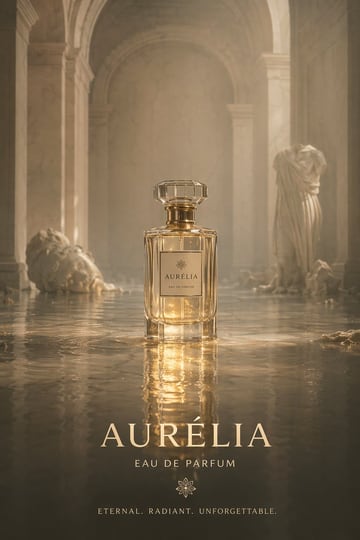 A cinematic product photography shot of an elegant, rectangular glass perfume bottle with a faceted crystal cap and gold accents, sitting in the center of a shallowly flooded ancient stone temple corridor. The bottle features a minimalist square label with a delicate flower logo and the text {argument name="brand name" default="AURÉLIA"} above "EAU DE PARFUM". The setting is ethereal and hazy, bathed in warm, golden volumetric lighting that creates glowing reflections on the rippled water surface. In the background, classical ruins emerge from the water: a fallen stone head on the left and a headless draped statue on the right. At the bottom of the image, elegant typography overlays the scene, featuring the large serif text {argument name="brand name" default="AURÉLIA"}, followed by "EAU DE PARFUM", a matching flower logo, and the tagline {argument name="tagline" default="ETERNAL. RADIANT. UNFORGETTABLE."} in a clean, spaced-out font.