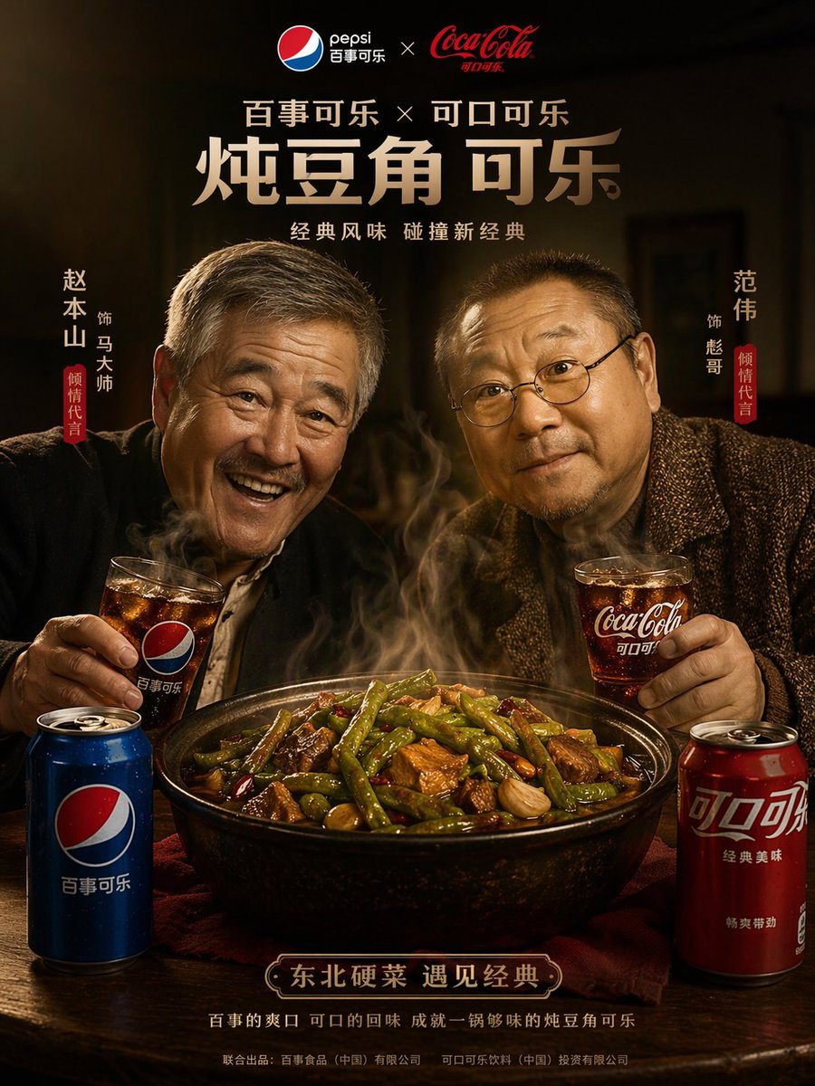 生成一张极具戏剧张力的高质量广告海报,展示两位角色共同用餐及竞争饮料品牌,并配有可自定义的排版设计。