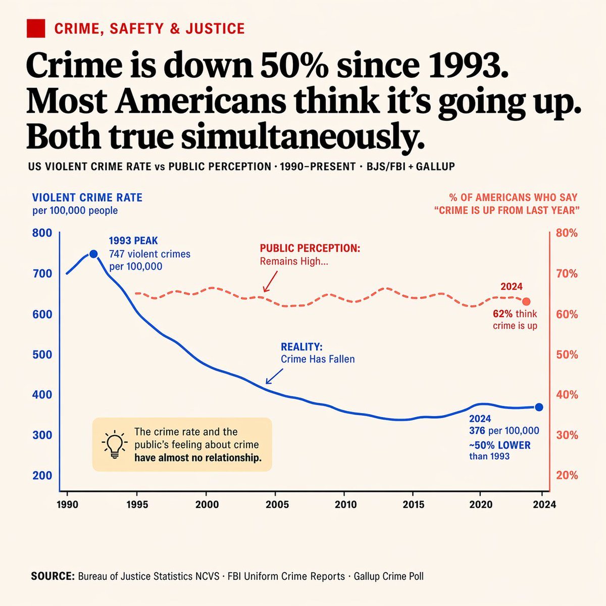 { "type": "editorial infographic dual-axis line chart", "style": "clean, newspaper-style, off-white background, highly legible typography", "header": { "category": "CRIME, SAFETY & JUSTICE (red text with red square icon)", "headline": "{argument name=\"main headline\" default=\"Crime is down 50% since 1993. Most Americans think it's going up. Both true simultaneously.\"}", "sub_headline": "US VIOLENT CRIME RATE vs PUBLIC PERCEPTION · 1990-PRESENT · BJS/FBI + GALLUP" }, "chart": { "x_axis": "Years 1990 to 2024 with 8 tick marks", "left_y_axis": { "color": "blue", "label": "{argument name=\"left axis label\" default=\"VIOLENT CRIME RATE per 100,000 people\"}", "range": "200 to 800" }, "right_y_axis": { "color": "red", "label": "{argument name=\"right axis label\" default=\"% OF AMERICANS WHO SAY 'CRIME IS UP FROM LAST YEAR'\"}", "range": "20% to 80%" }, "data_series": [ { "name": "Reality", "style": "solid blue line", "trend": "peaks early then drops significantly", "annotations": [ "1993 PEAK 747 violent crimes per 100,000 (with blue dot)", "REALITY: Crime Has Fallen (with blue arrow pointing to line)", "2024 376 per 100,000 ~50% LOWER than 1993 (with blue dot)" ] }, { "name": "Public Perception", "style": "dashed red line", "trend": "remains relatively flat and high", "annotations": [ "PUBLIC PERCEPTION: Remains High... (with red arrow pointing to line)", "2024 62% think crime is up (with red dot)" ] } ] }, "callout_box": { "position": "bottom left inside chart area", "style": "light yellow rectangle", "icon": "lightbulb", "text": "{argument name=\"callout text\" default=\"The crime rate and the public's feeling about crime have almost no relationship.\"}" }, "footer": { "text": "SOURCE: {argument name=\"footer source\" default=\"Bureau of Justice Statistics NCVS · FBI Uniform Crime Reports · Gallup Crime Poll\"}" } }