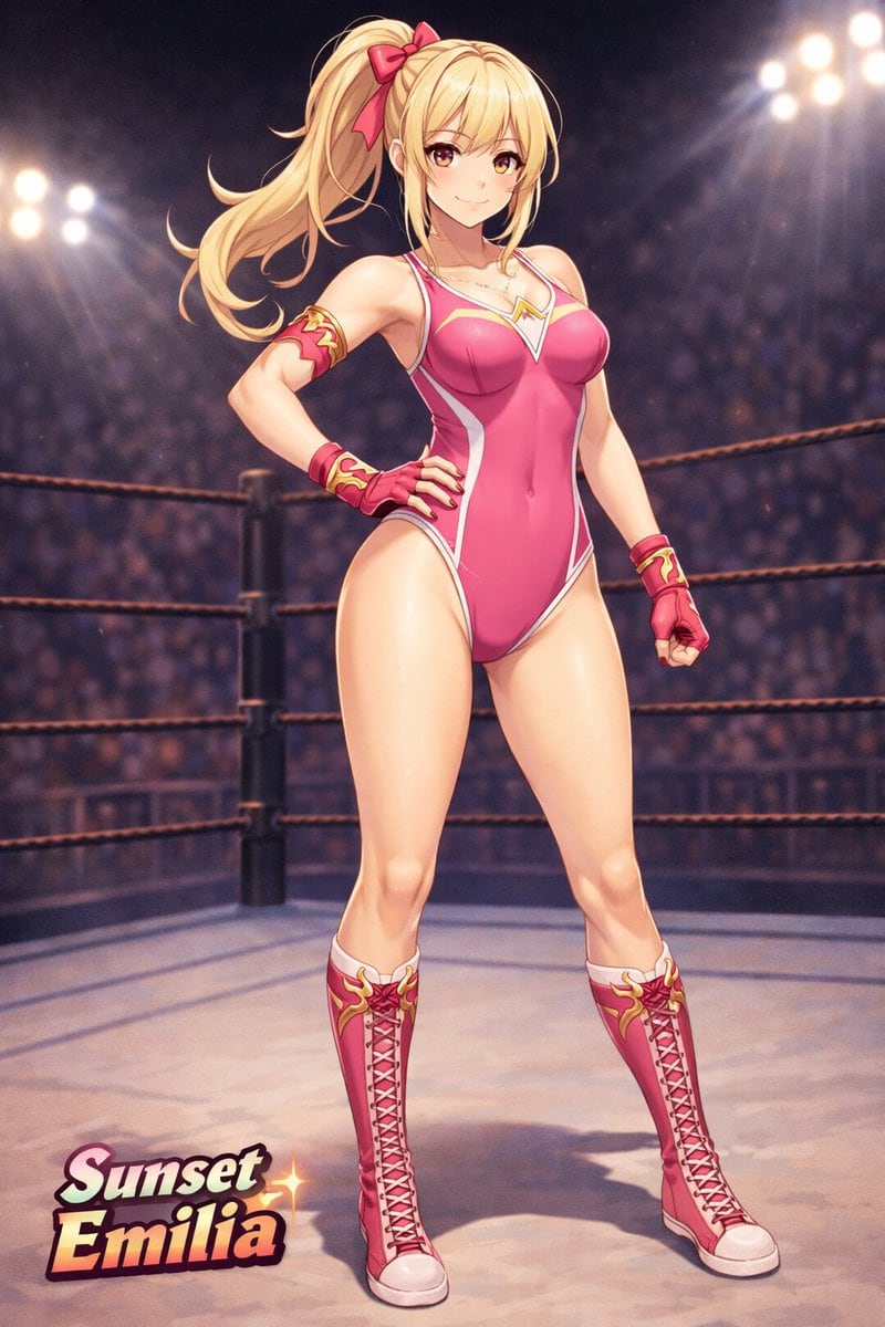 An anime illustration of a confident female wrestler standing in a ring. She has {argument name="hair color" default="blonde"} hair in a high ponytail with a pink bow. She wears a {argument name="outfit color" default="pink"} one-piece leotard with white and gold accents, matching fingerless gloves, and knee-high lace-up boots. She poses with one hand on her hip under bright stadium spotlights, with a blurred audience in the background. A stylized logo in the bottom left reads "{argument name="logo text" default="Sunset Emilia"}". The style features detailed shading and glossy skin highlights.