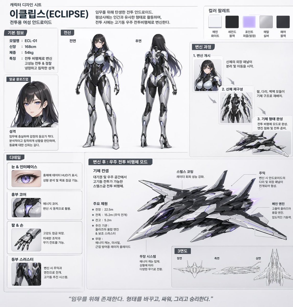 날렵한 {argument name="기체 종류" default="우주 전투비행체"}로 변신이 가능한, {argument name="성별" default="여성"} {argument name="캐릭터 유형" default="안드로이드"} 캐릭터에 대한 캐릭터 디자인 시트. 한국어로.