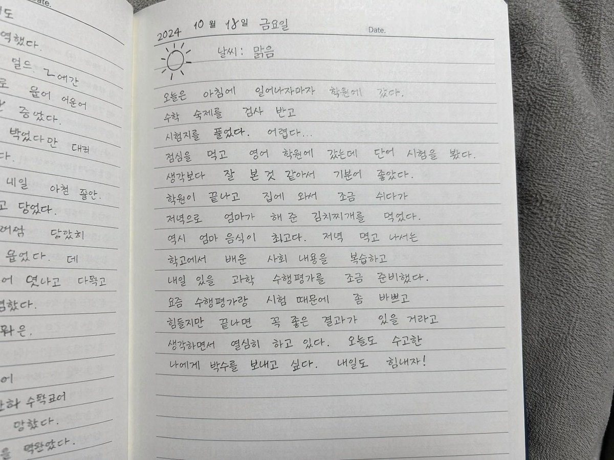 A photorealistic, casual top-down snapshot of an open lined notebook resting on a textured gray fabric surface. The notebook pages are filled with {argument name="handwriting style" default="neat, legible Korean handwriting"}. The right page is the main focus, starting with the date "{argument name="date" default="2024 10월 18일 금요일"}" at the top left and a printed "Date." at the top right. Below the date is a small hand-drawn sun icon next to the text "{argument name="weather" default="날씨: 맑음"}". The rest of the page contains about 14 lines of handwritten text detailing {argument name="content topic" default="a student's daily diary entry about going to academies, taking tests, eating kimchi jjigae, and studying"}. The left page is partially visible, also containing handwritten Korean text. The lighting is natural and soft, giving the impression of a personal, everyday photograph.