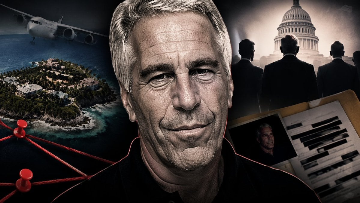 A YouTube thumbnail-style collage for a {argument name="overall mood" default="dark, dramatic, true crime investigation"}. In the center is a highly detailed, close-up portrait of an {argument name="central figure" default="older man with grey hair and deep wrinkles resembling Jeffrey Epstein"}, wearing a black polo shirt, with a faint red glowing outline separating him from the background. On the left side, a {argument name="left background scene" default="tropical island with luxury villas and a flying airplane in a dark sky"}. Below the island, a conspiracy board motif features exactly 2 red push pins connected by 3 thick red strings. On the top right side, a hazy, sepia-toned depiction of the {argument name="right background scene" default="US Capitol building with the silhouettes of 3 men in suits facing it"}. On the bottom right, an open manila folder containing a {argument name="document type" default="heavily redacted dossier with thick black marker lines and a smaller photograph of the central man"}. The overall composition is cinematic, intense, and heavily stylized for a documentary video.