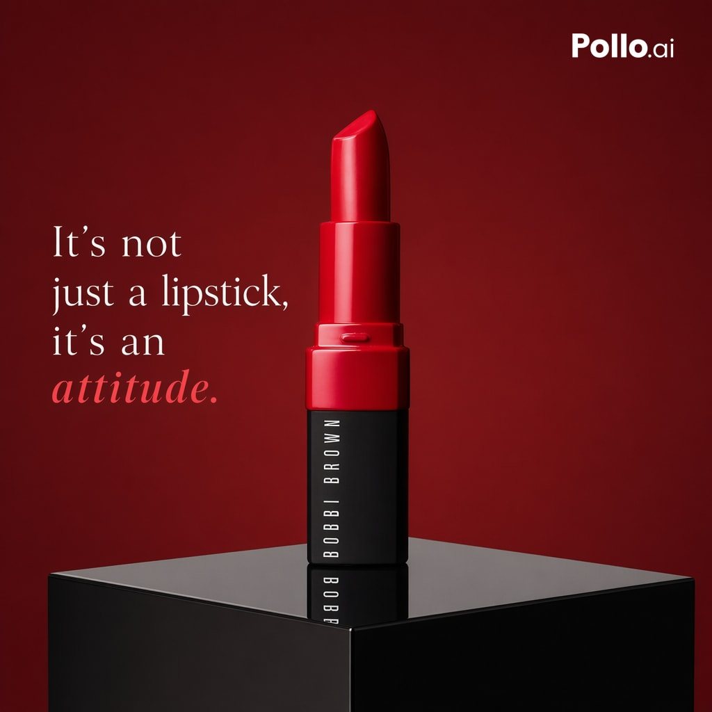 A luxury cosmetics advertisement poster featuring a single upright {argument name="product type" default="lipstick"} centered on a glossy black cube pedestal against a rich monochrome {argument name="background color" default="deep crimson red"} studio background. The product is a bold satin-finish {argument name="product shade" default="true red"} lipstick with the bullet fully extended, dramatic sculpted tip, and a two-tone tube: vivid red upper casing and matte black lower casing. On the front of the black base, vertical white brand text reads {argument name="brand name" default="BOBBI BROWN"}. Place elegant editorial copy on the left side in a refined high-fashion serif layout, split across multiple lines, reading {argument name="headline text" default="It’s not just a lipstick, it’s an attitude."}, with the final word styled in italic and a slightly brighter coral-red tone than the rest of the text. Add 1 small white logo watermark in the top-right corner reading {argument name="logo text" default="Pollo.ai"}. Use cinematic product lighting with soft but high-contrast highlights, subtle reflections on the pedestal, crisp edges, premium beauty-campaign styling, minimalist composition, square format, clean negative space, and a polished ecommerce-ready luxury ad aesthetic.