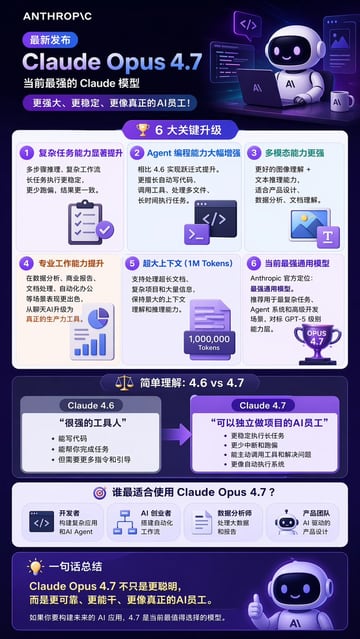 { "type": "long vertical infographic poster", "style": "modern tech, 3D isometric illustrations, dark purple and blue color palette, glassmorphism UI elements", "header": { "logo": "{argument name=\"company logo\" default=\"ANTHROPIC\"}", "badge": "最新发布", "title": "{argument name=\"product name\" default=\"Claude Opus 4.7\"}", "subtitle": "{argument name=\"main subtitle\" default=\"当前最强的 Claude 模型\"}", "tagline": "更强大、更稳定、更像真正的AI员工!", "illustration": "3D cute robot sitting at a desk with a laptop, coffee mug, and floating code windows" }, "layout": { "sections": [ { "title": "6 大关键升级", "icon": "3D gold trophy", "layout": "2x3 grid", "count": 6, "items": [ {"title": "复杂任务能力显著提升", "icon": "3D clipboard with checkmarks"}, {"title": "Agent 编程能力大幅增强", "icon": "3D code terminal window"}, {"title": "多模态能力更强", "icon": "3D image and text document"}, {"title": "专业工作能力提升", "icon": "3D pie chart and bar graph"}, {"title": "超大上下文 (1M Tokens)", "icon": "3D document with 1,000,000 Tokens text"}, {"title": "当前最强通用模型", "icon": "3D purple trophy with OPUS 4.7 text"} ] }, { "title": "简单理解:4.6 vs 4.7", "icon": "3D balance scale", "layout": "side-by-side comparison with right-pointing arrow", "count": 2, "columns": [ { "header": "{argument name=\"comparison version 1\" default=\"Claude 4.6\"}", "quote": "很强的工具人", "style": "grey box" }, { "header": "{argument name=\"comparison version 2\" default=\"Claude 4.7\"}", "quote": "可以独立做项目的AI员工", "style": "purple box, highlighted" } ] }, { "title": "谁最适合使用 Claude Opus 4.7?", "icon": "3D target", "layout": "horizontal row", "count": 4, "labels": [ "开发者", "AI 创业者", "数据分析师", "产品团队" ] } ], "footer": { "title": "一句话总结", "icon": "3D lightbulb", "main_text": "Claude Opus 4.7 不只是更聪明,而是更可靠、更能干、更像真正的AI员工。", "sub_text": "如果你要构建未来的 AI 应用,4.7 是当前最值得选择的模型。", "illustration": "3D cute robot giving a thumbs up" } } }